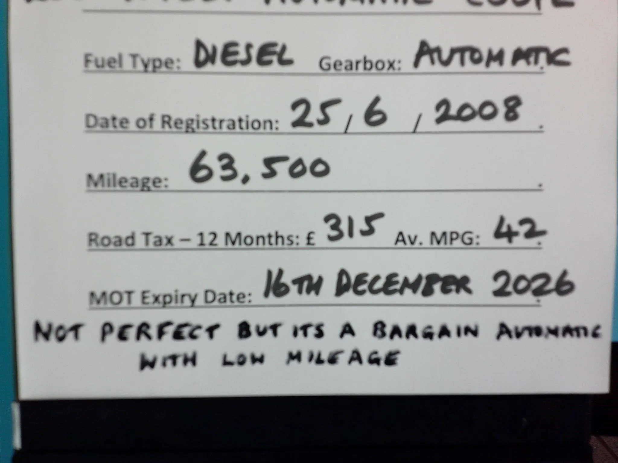 CLEARANCE VEHICLE TO BE SOLD AS SEEN WITH NO WARRANTY AS IT FALLS BELOW OUR AGE or MILEAGE or CONDITION LIMITS. Not perfect but its an old car. Low mileage at only 63500 miles. Automatic. Bargain clearance car. MOT until 16th December 2026, Not perfect but its a great bargain. Contact Jason Crew at Crews Car Sales, Five Square Motors, Salisbury Road, Shaftesbury, Dorset. SP7 8BU, PLEASE ARRANGE AN APPOINTMENT FOR VIEWINGS & ENSURE YOU BRING YOUR DRIVING LICENCE.