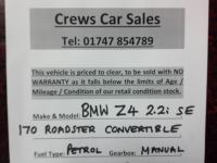 CLEARANCE VEHICLE TO BE SOLD AS SEEN WITH NO WARRANTY AS IT FALLS BELOW OUR AGE or MILEAGE or CONDITION LIMITS. MOT until 17th June 2026. Bargain BMW sports convertible. Has had the usual steering column motor replacement which is a common failure on these cars so it shouldn't be an issue in the future. Contact Jason Crew at Crews Car Sales on 01747 854789, Crews Car Sales, Five Square Motors, Salisbury Road, Shaftesbury, Dorset. SP7 8BU. Not perfect but its cheap, NO, it doesn't have a warranty. NO, we will not swap it for a camel or a subscription to Netflix or a pair of nice shoes. It is what it is, a cheap bargain car. Sensible offers considered after viewing, stupid offers will be ignored, Please do NOT expect a response out of working hours.