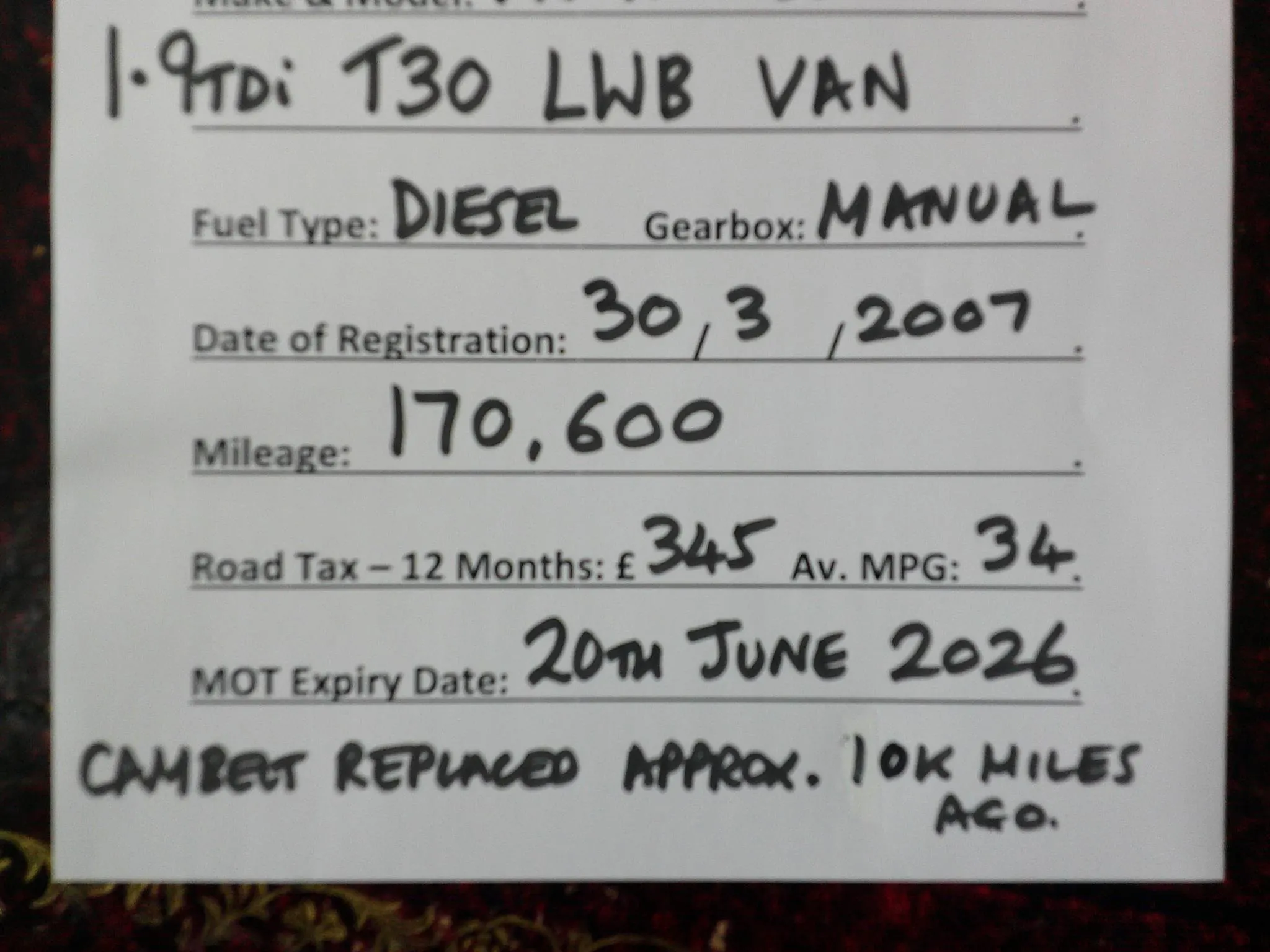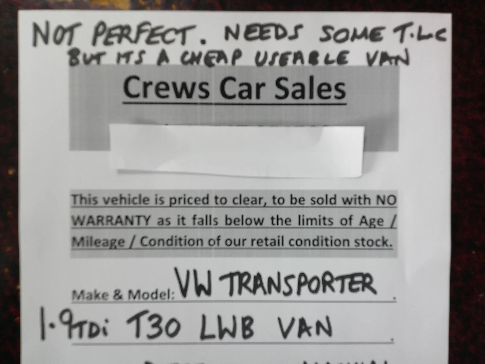 Bargain clearance vehicle to be sold as seen with no warranty as it falls below our limits of age mileage condition. Cambelt replaced approx. 10k miles ago. 20 inch wheel upgrade. MOT June 2026. Not perfect, would benefit from some TLC but its a cheap Transporter Long Wheel Base 1.9TDi. Contact Jason Crew at Crews Car Sales, Five Square Motors, Salisbury Road, Shaftesbury, Dorset. SP7 8BU.